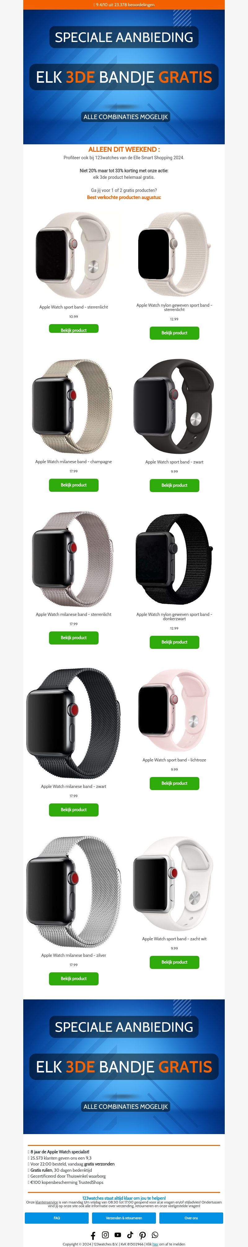 Alleen dit weekend hebben we een speciale aanbieding bij 123watches.nl! Ontvang niet 20% maar zelfs 33% korting op Apple Watch bandjes. Koop 2 bandjes en ontvang de 3de helemaal gratis. Bekijk ons uitgebreide assortiment aan Apple Watch bandjes en kies jouw favoriete combinatie. Alle combinaties zijn mogelijk.