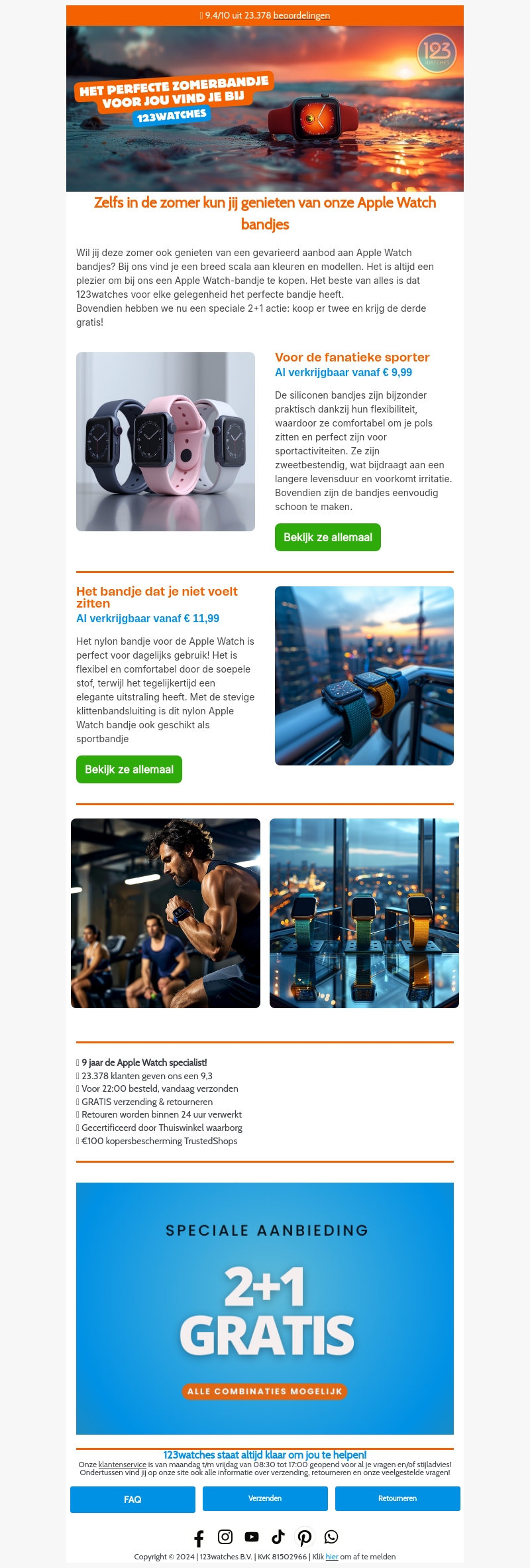 Wil je deze zomer ook genieten van een gevarieerd aanbod aan Apple Watch bandjes? Bij ons vind je een breed scala aan kleuren en modellen. Mis onze speciale 2+1 aanbieding niet: koop er twee en krijg de derde gratis! Bekijk onze comfortabele, flexibele en stijlvolle bandjes vanaf € 9,99.