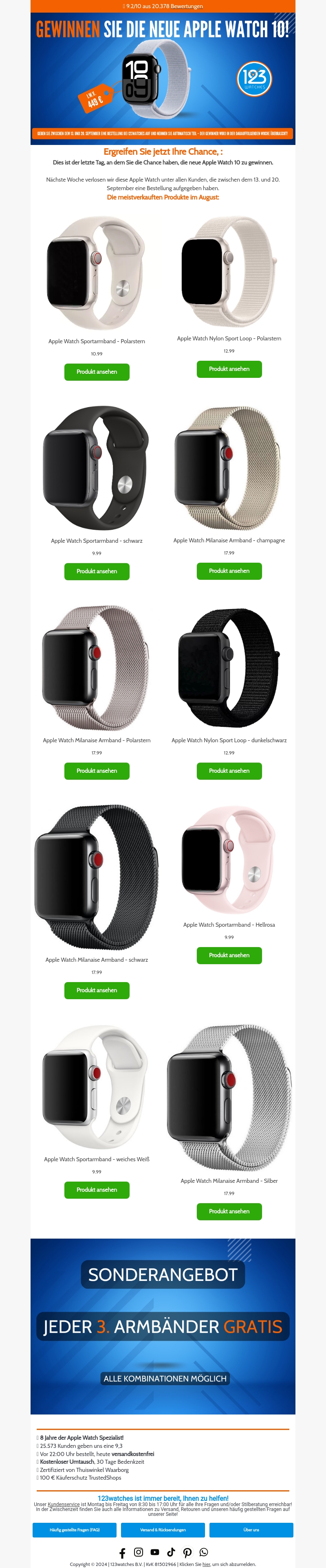 Ergreifen Sie jetzt Ihre Chance und gewinnen Sie die neueste Apple Watch 10. Schauen Sie sich unsere meistverkauften Produkte im August an und profitieren Sie von unserem Sonderangebot: Beim Kauf von zwei Armbändern ist das dritte gratis. Nur noch heute!