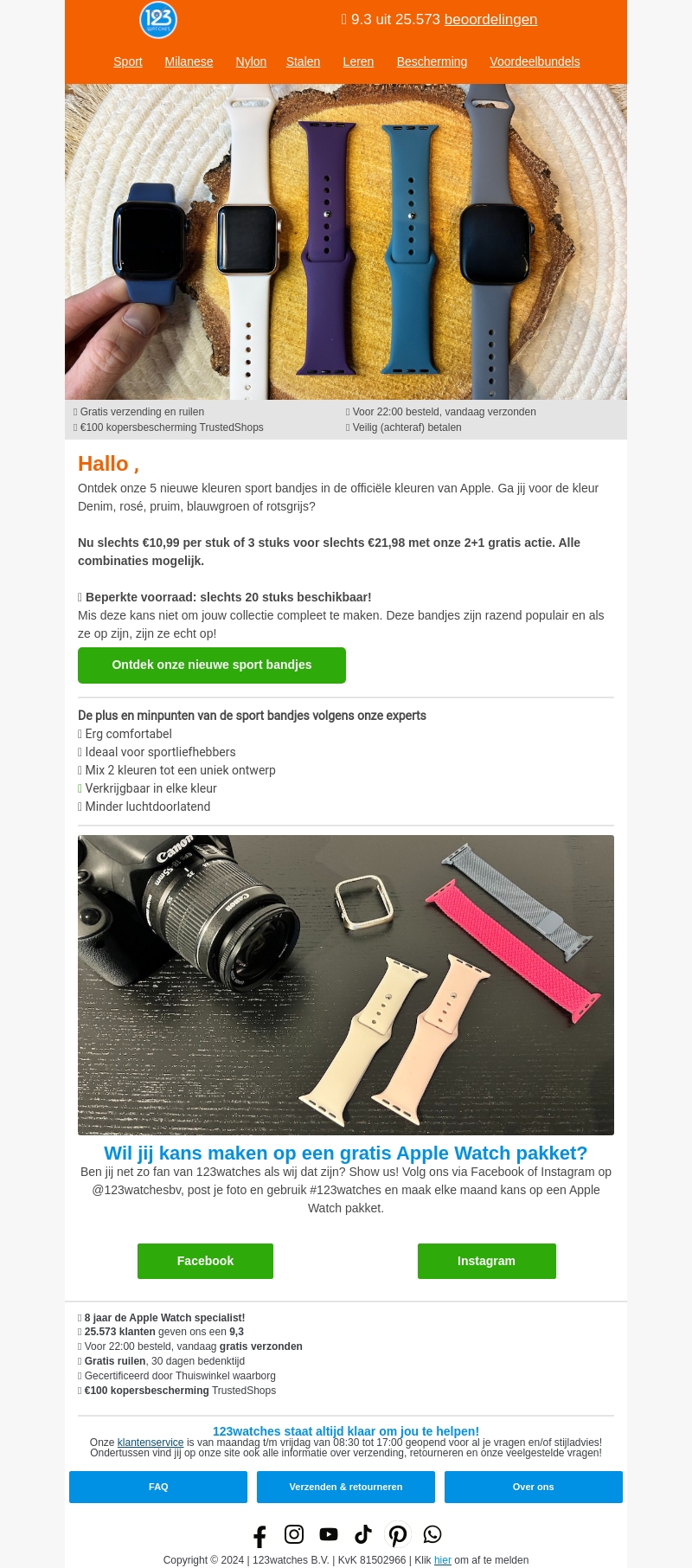 Ontdek de vijf nieuwe kleuren sportbandjes in de officiële kleuren van Apple. Ga voor denim, rosé, pruim, blauwgroen of rotsgrijs. Nu slechts €10,99 per stuk met een speciale 2+1 actie. Beperkte voorraad beschikbaar, dus wees er snel bij om jouw favoriet te bemachtigen.