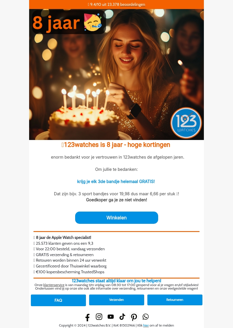 123watches viert zijn 8e verjaardag! Bedankt voor je vertrouwen. Om dit te vieren, krijg je elk 3de bandje helemaal gratis. Dit betekent dat je 3 sport bandjes krijgt voor slechts 6,66 per stuk. Profiteer nu van deze en andere geweldige kortingen!