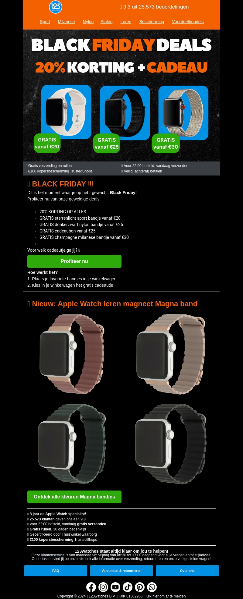 Black Friday is hier en het wachten is voorbij! Geniet van 20% korting op alles en ontvang gratis cadeau’s bij aankoop van Apple Watch bandjes. Of je nu kiest voor een sportband, nylon band of een champagne Milanese band, er is voor ieder wat wils. Verwen jezelf met een nieuwe look en profiteer van deze ongekende aanbiedingen.