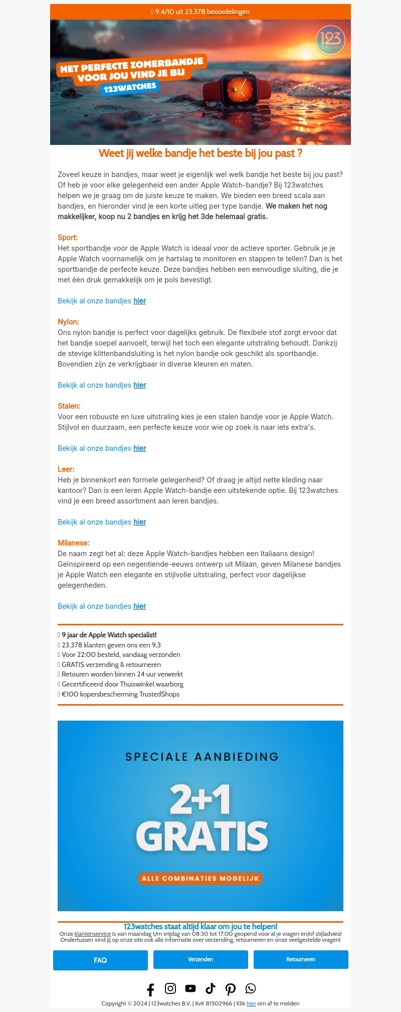 De zomervakantie is bijna voorbij en het is tijd om je Apple Watch een nieuwe look te geven. 123watches biedt een breed scala aan bandjes aan, van sportief tot elegant. Profiteer nu van de speciale aanbieding: koop 2 bandjes en krijg de derde helemaal gratis!