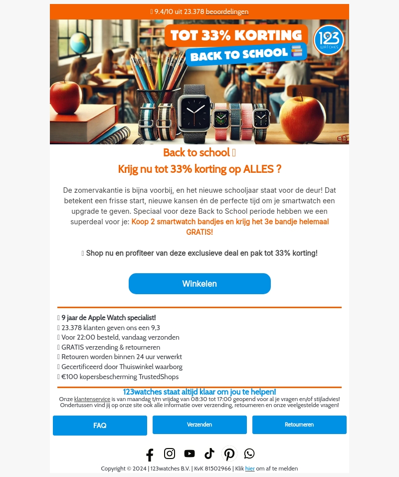 De zomervakantie is bijna voorbij en het nieuwe schooljaar staat voor de deur. Dat betekent nieuwe kansen en de perfecte tijd om jouw smartwatch te upgraden. Speciaal voor deze Back to School periode hebben wij een superdeal: Koop 2 smartwatch bandjes en krijg het 3e gratis. Begin je schooljaar met stijl en bespaar bij 123watches! Shop nu en bespaar tot 33% op alles.