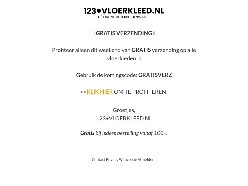 Bij 123VLOERKLEED.NL profiteer je dit weekend van gratis verzending op alle vloerkleden! Gebruik de kortingscode GRATISVERZ en klik hier om te profiteren. Gratis verzending bij iedere bestelling vanaf 100,-.