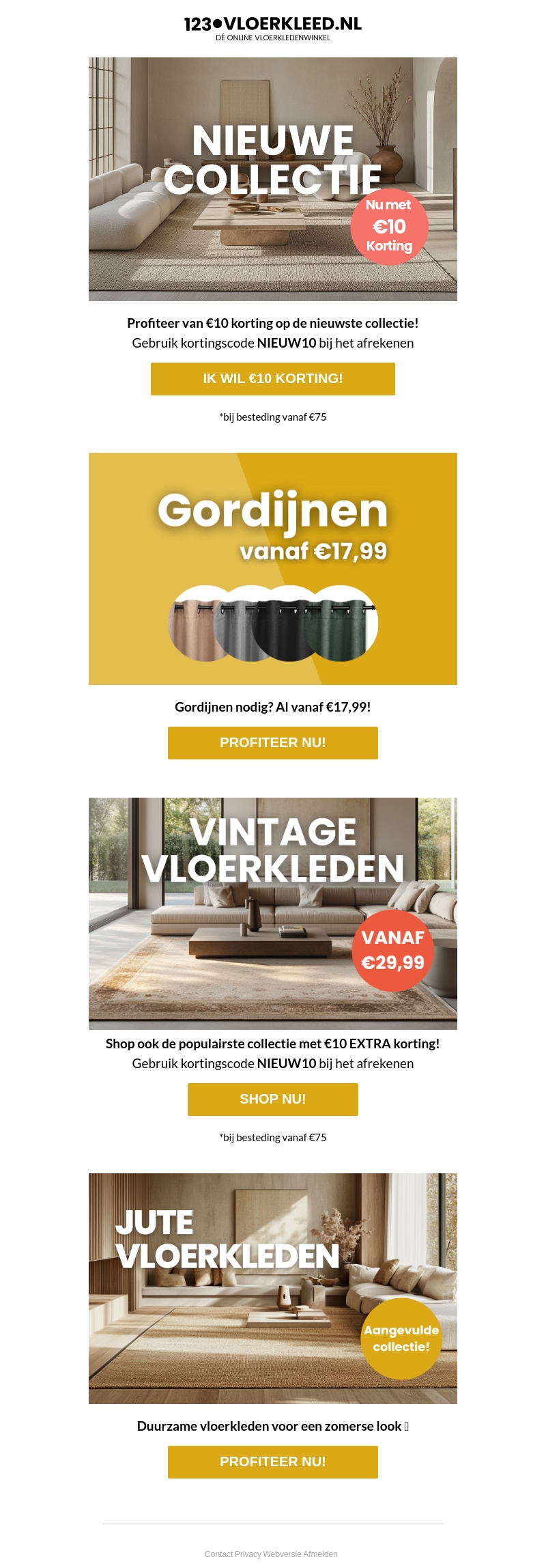 Profiteer van €10 korting op de nieuwste collectie vloerkleden bij een besteding vanaf €75. Gebruik de kortingscode NIEUW10 bij het afrekenen. Ontdek ook onze gordijnen vanaf €17,99 en vintage vloerkleden vanaf €29,99. Duurzame jute vloerkleden nu in aangevulde collectie.