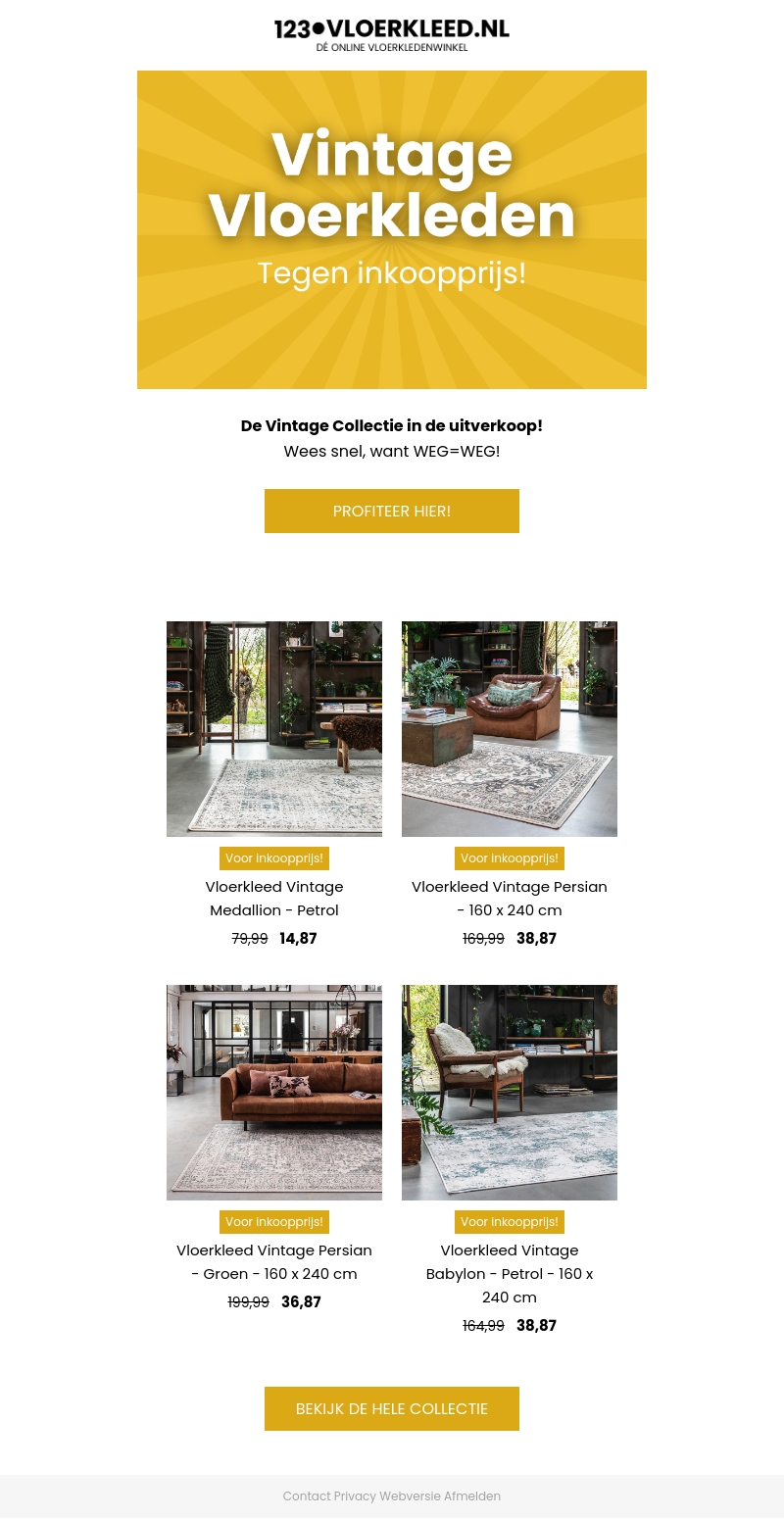 Ontdek onze unieke collectie vintage vloerkleden tegen inkoopprijs. We hebben verschillende stijlen en maten beschikbaar, perfect om elk interieur te verrijken. Wees snel, want weg=weg! Profiteer nu en upgrade je woonruimte met de mooiste vloerkleden.