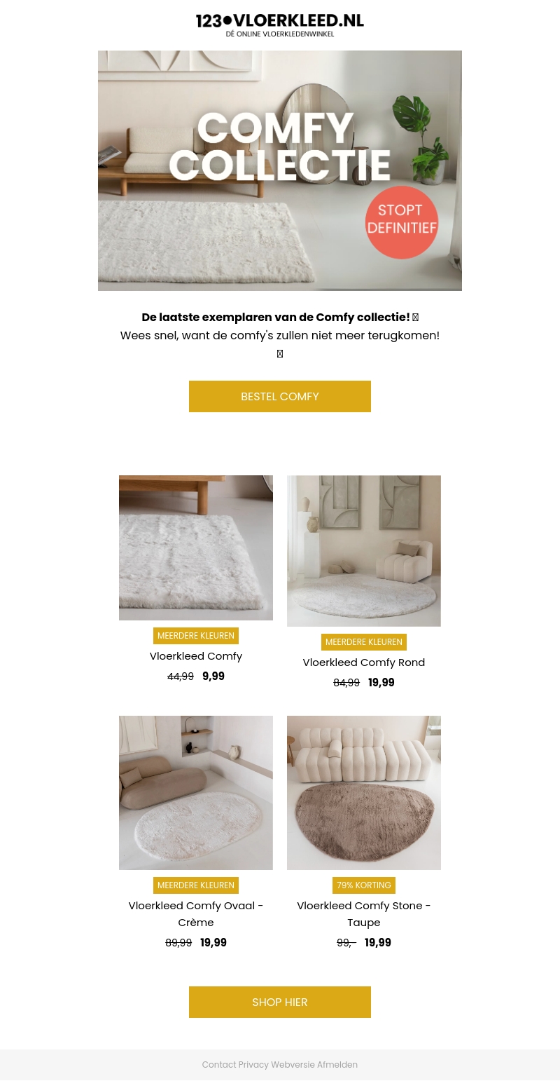 De Comfy collectie is aan zijn einde gekomen en dat betekent flinke kortingen op de laatste exemplaren! Van rechthoekige tot ronde en ovale vloerkleden, alles gaat weg. Mis deze geweldige kans niet om je huis te voorzien van een zachte en stijlvolle upgrade.