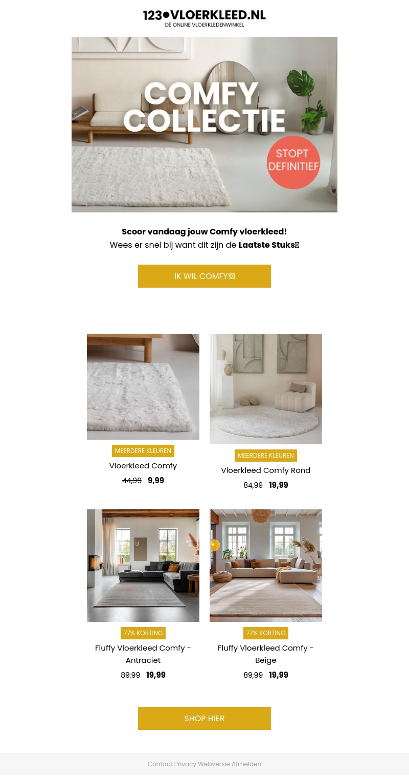 Ontdek de nieuwste collectie Comfy vloerkleden bij 123Vloerkleed.nl. Deze zachte en stijlvolle vloerkleden zijn perfect voor elk huis. We hebben de laatste stuks, dus wees er snel bij! Profiteer nu van kortingen tot wel 77%.