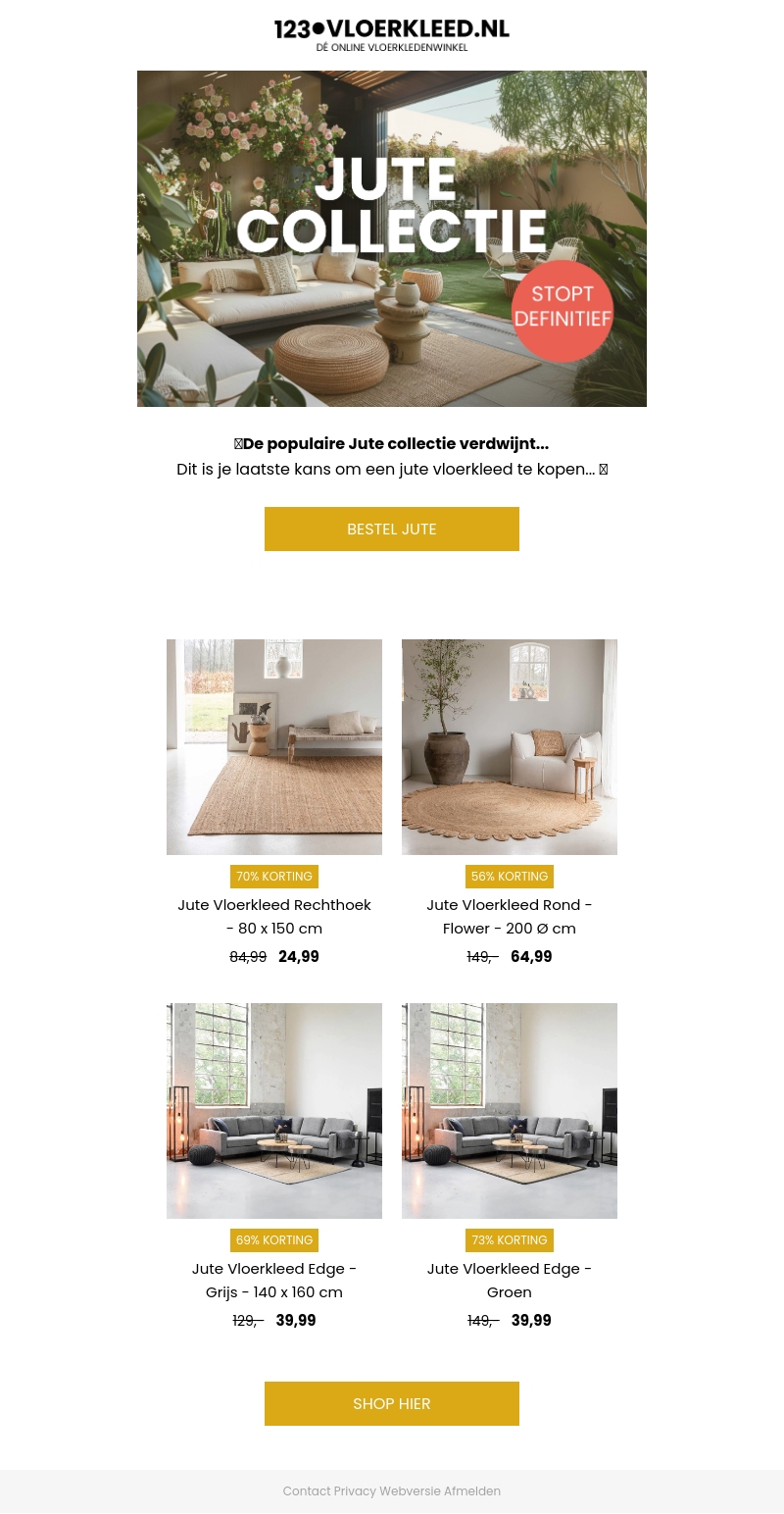Onze populaire Jute collectie verdwijnt voorgoed. Dit is je laatste kans om deze prachtige jute vloerkleden met hoge kortingen te kopen. Bekijk nu onze aanbiedingen en bestel snel voordat het te laat is!