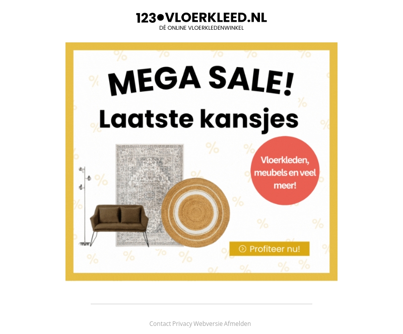 Mis de Mega Sale bij 123 Vloerkleed niet! Dit is je laatste kans om geweldige kortingen te krijgen op vloerkleden, meubels en nog veel meer. Pak deze unieke deals voordat ze weg zijn!
