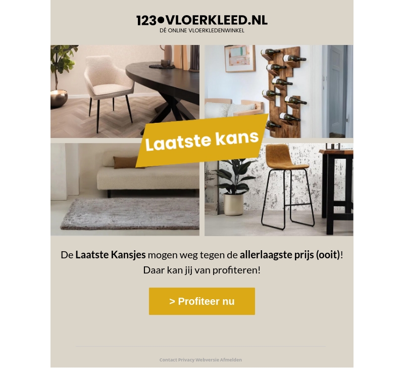 123Vloerkleed.nl biedt nu de allerlaagste prijzen ooit met hun Laatste Kansjes Leegverkoop. Mis deze kans niet om hoogwaardige vloerkleden en meubels te kopen tegen ongelooflijke kortingen. Van moderne designs tot klassieke stijlen, er is voor elk wat wils. Deze exclusieve aanbieding geldt alleen voor nu, dus grijp deze kans terwijl het nog kan. Bezoek onze website en vind jouw favoriete items. Profiteer nu en vernieuw je interieur!