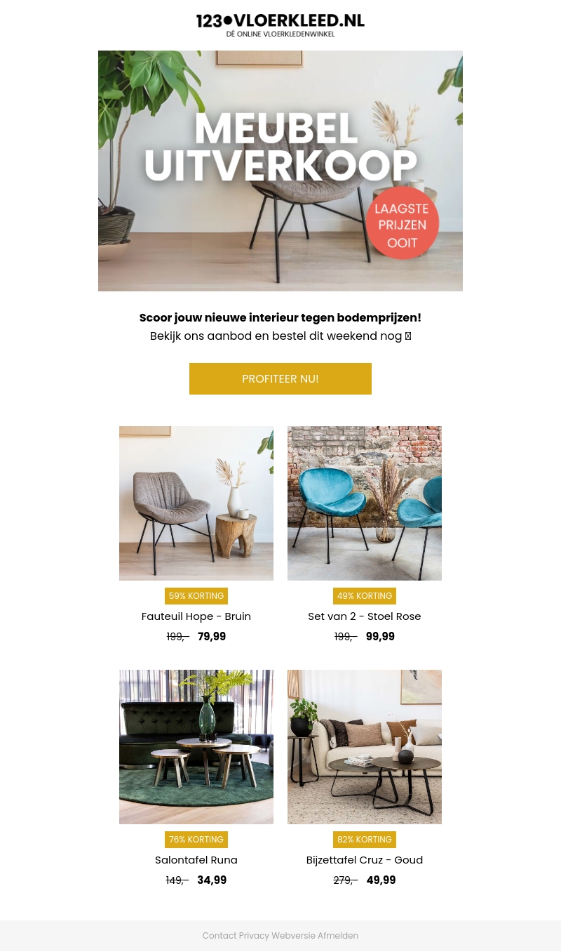 Laatste kans om te profiteren van de meubelleegverkoop bij 123Vloerkleed.nl. Ontdek geweldige kortingen op fauteuils, stoelen, salontafels en meer. Bestel snel en vernieuw jouw interieur tegen de laagste prijzen ooit. Bekijk het aanbod nu en profiteer van deze unieke aanbieding!