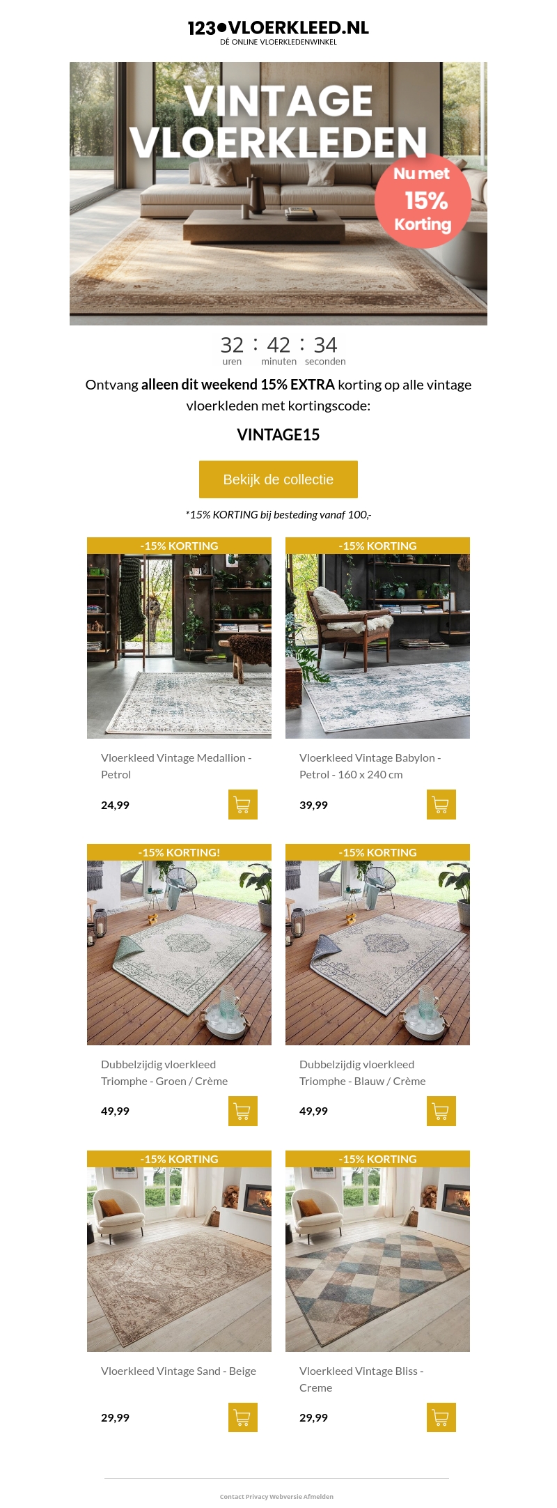 Mis deze weekendactie niet! Profiteer van 15% extra korting op alle vintage vloerkleden bij 123Vloerkleed.nl. Gebruik de kortingscode VINTAGE15 en geef je interieur een stijlvolle update. Bekijk nu onze prachtige collectie en verfraai je woonruimte met kwaliteit en luxe.