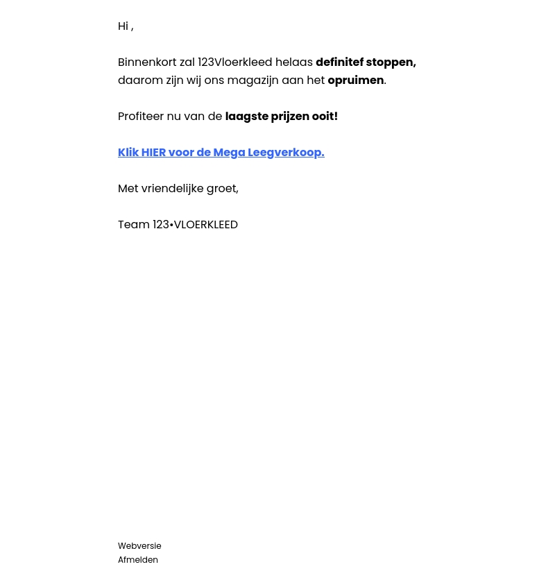 Binnenkort zal 123Vloerkleed helaas definitief stoppen, daarom ruimen wij ons magazijn op met de laagste prijzen ooit! Mis deze kans niet om te profiteren van de mega leegverkoop.