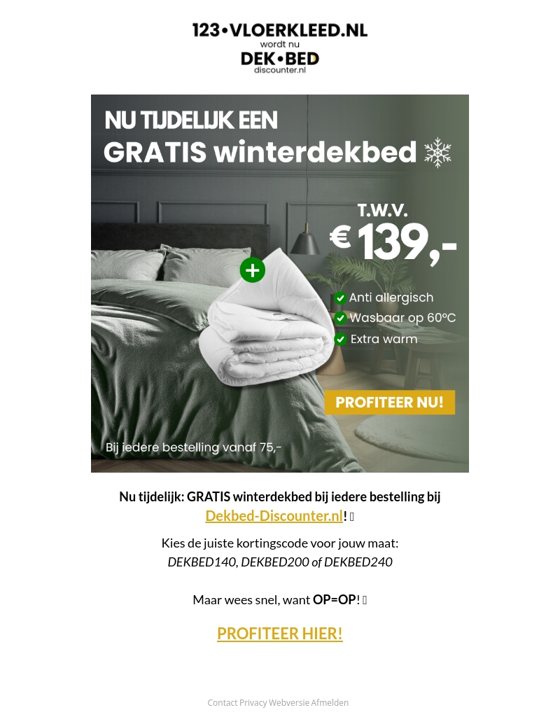 Profiteer tijdelijk van een gratis winterdekbed ter waarde van €139 bij Dekbed-Discounter. Dit anti-allergische dekbed is wasbaar op 60°C en biedt extra warmte. Kies de juiste kortingscode voor jouw bestelling en wees er snel bij, want op=op!
