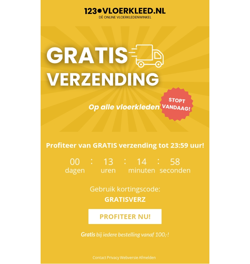 123Vloerkleed.nl biedt vandaag GRATIS verzending op alle vloerkleden! Gebruik de kortingscode GRATISVERZ en koop voordelig je favoriete vloerkleed. Deze actie is geldig tot 23:59 uur, dus wees er snel bij!