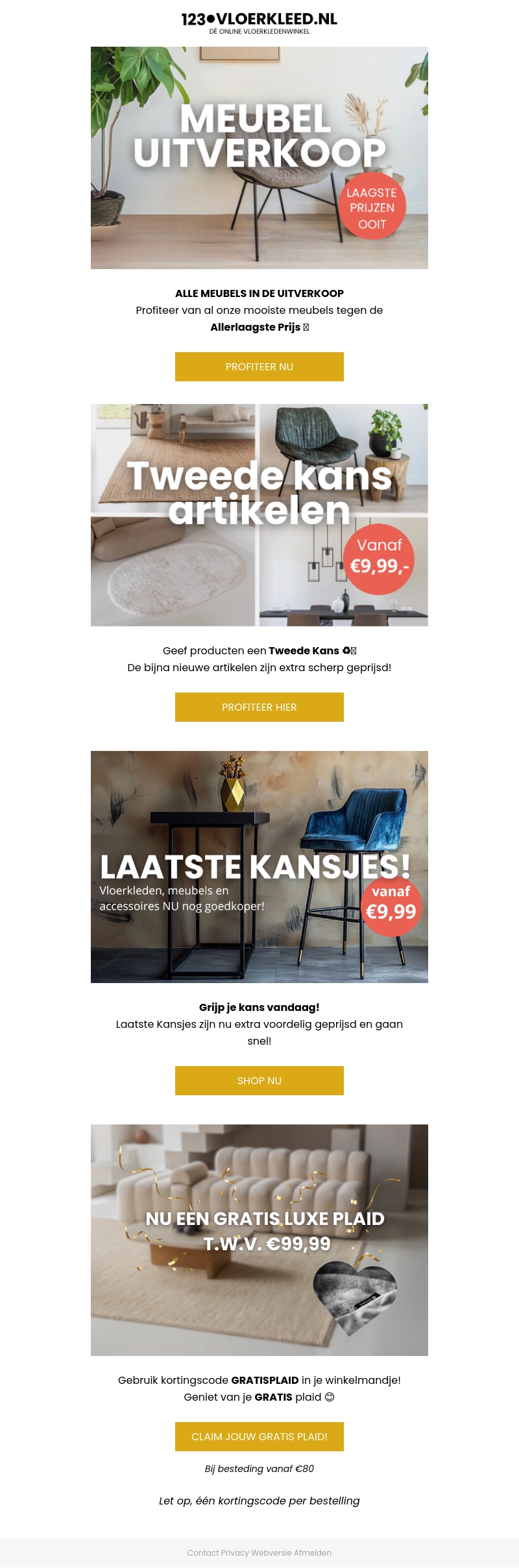 Bekijk onze meubeluitverkoop met de allerlaagste prijzen ooit. Ontdek tweede kans artikelen scherp geprijsd vanaf €9,99. Mis de laatste kansjes niet en ontvang een gratis luxe plaid bij besteding vanaf €80.