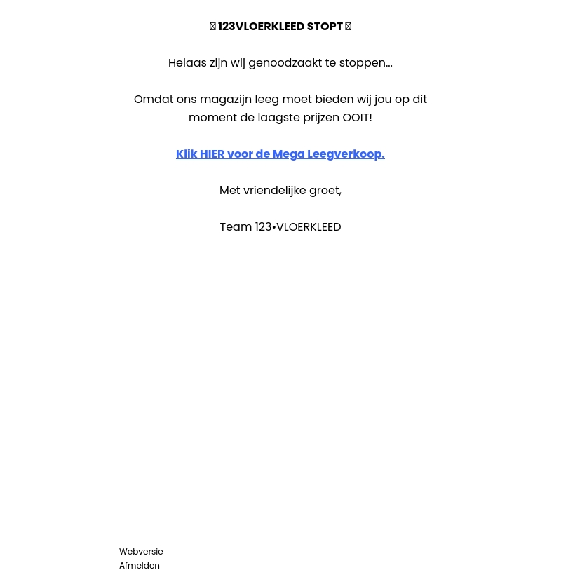 123VLOERKLEED stopt en daarom houden we een Mega Uitverkoop. Ons magazijn moet leeg, dus dit is jouw kans om vloerkleden tegen de laagste prijzen ooit te bemachtigen! Klik snel op de link om te profiteren van deze aanbiedingen voordat het te laat is.