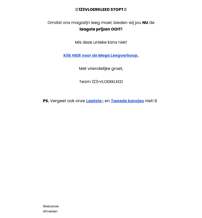 123Vloerkleed beΓ«indigt zijn magazijn en biedt nu de laagste prijzen ooit aan. Mis deze unieke kans niet en klik nu om naar de Megaverkoop te gaan. Vergeet ook niet onze laatste- en tweede kansjes!