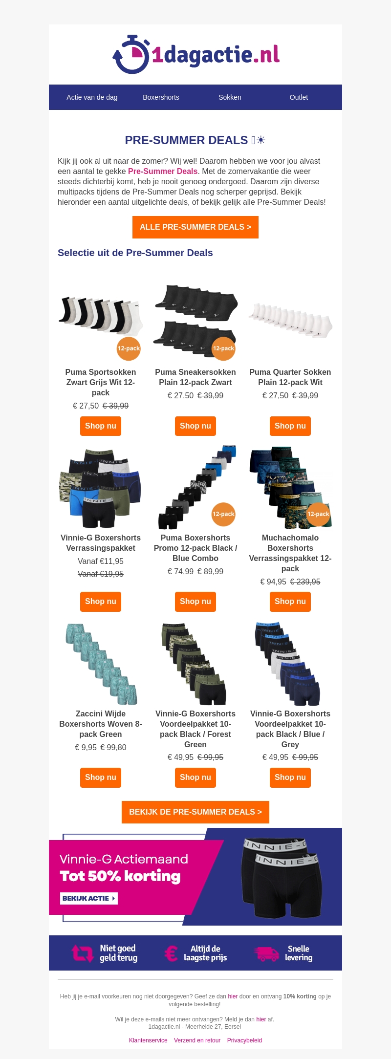 Kijk je ook al uit naar de zomer? Wij ook! Daarom hebben we voor jou alvast een aantal te gekke Pre-Summer Deals. Profiteer van scherpe prijzen op diverse multipacks sokken en boxershorts. Bekijk hieronder een aantal uitgelichte deals en bespaar nu!