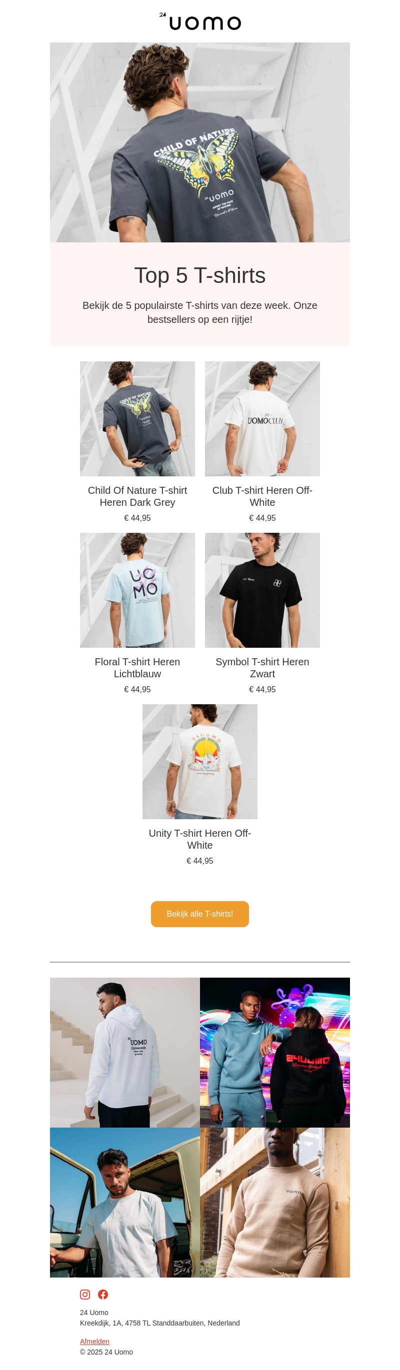 Ontdek de meest gewilde T-shirts van deze week bij 24 Uomo. Van stoere prints tot minimalistisch design, we hebben iets voor elke stijl. Onze topkeuzes zorgen ervoor dat je er altijd modieus uitziet. Mis deze unieke collectie niet, perfect voor elke gelegenheid. Ze zijn ideaal voor casual en stijlvolle looks. Snelle levering en premium kwaliteit gegarandeerd.