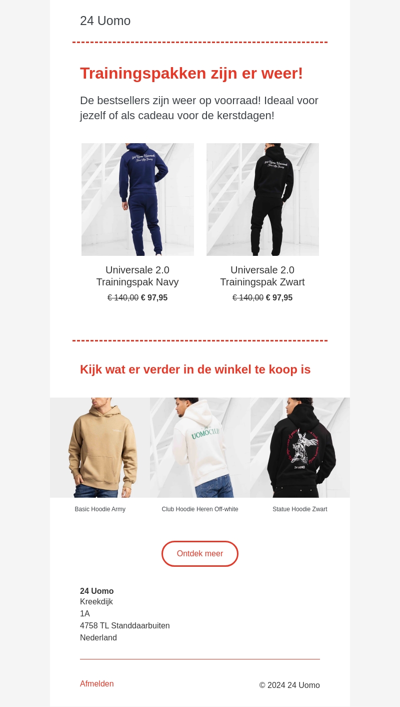 De populaire trainingspakken zijn weer beschikbaar! Ideaal als cadeaus voor de feestdagen of om jezelf te verwennen. Ontdek onze selectie van navy en zwarte trainingspakken, nu voordelig geprijsd. Kijk verder in de winkel voor meer stijlvolle mode-opties. Mis deze kans niet om uw garderobe te vernieuwen!