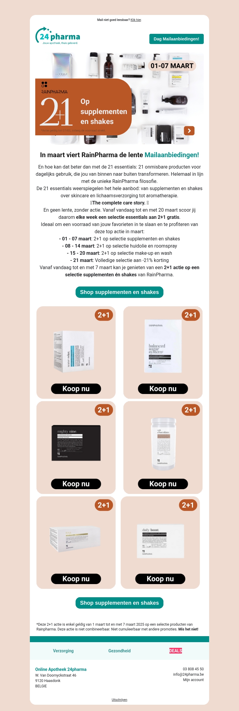In de maand maart biedt RainPharma een speciale 2+1 actie aan op geselecteerde shakes en supplementen. Elke week is er een nieuwe selectie van essentials beschikbaar, die perfect aansluiten bij de filosofie van complete verzorging. Dit is de ideale gelegenheid om je favoriete producten in te slaan en te genieten van extra voordeel. Zorg dat je er snel bij bent, want deze aanbieding geldt alleen in de maand maart!