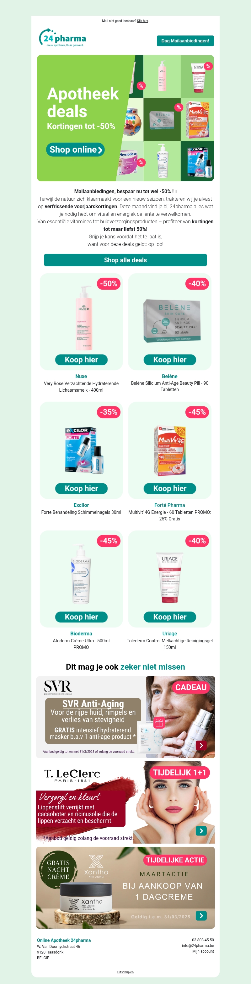 Ontdek nu de fantastische kortingen tot 50% bij 24pharma. Van hydraterende lichaamsmelk tot schimmelbehandelingen, wij hebben de beste deals voor jou. Mis het niet en bekijk onze exclusieve aanbiedingen voor de lente. Beperk je uitgaven en zorg goed voor jezelf met onze selectie van hoogwaardige producten.