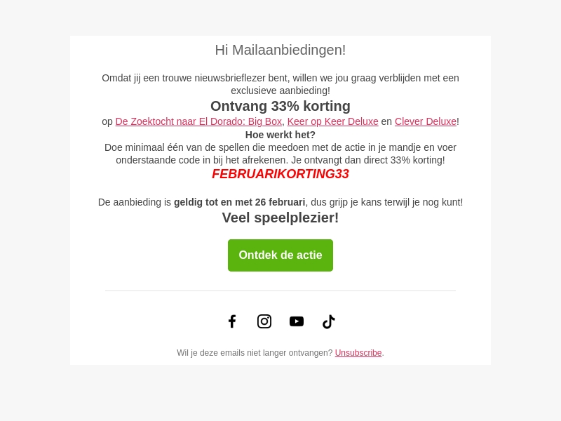Als trouwe lezer bieden we jou een exclusieve korting van 33% op populaire spellen zoals De Zoektocht naar El Dorado en Clever Deluxe! Voeg een deelnemend spel toe aan je mandje en gebruik de code FEBRUARIKORTING33 tijdens het afrekenen. Geldig tot en met 26 februari, dus wacht niet te lang!