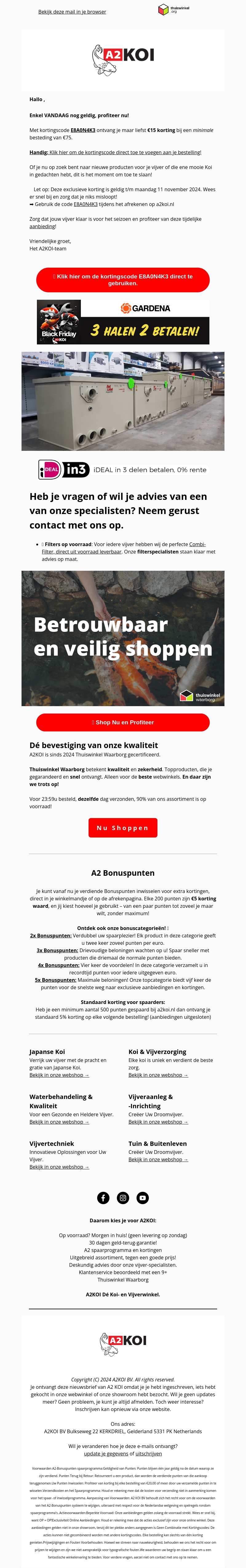 Grijp de kans om deze avond €15 korting te krijgen op je aankoop. Gebruik de kortingscode: EBANK43 bij besteding vanaf €75. Ontdek ons brede assortiment en profiteer van exclusieve aanbiedingen. Veilig winkelen gegarandeerd met onze kwaliteitsprestaties. Bezoek onze site voor meer details en shop veilig bij A2KOI.