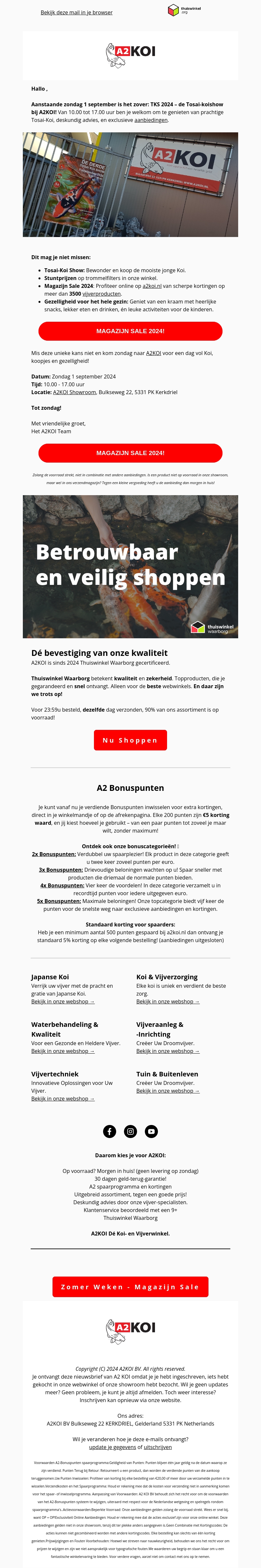 Komende zondag 1 september organiseert A2 KOI de Tosai-koishow van 10:00 tot 17:00 uur. Daarnaast hebben we een grote magazijn sale met scherpe kortingen. Ontvang bonuspunten en geniet van betrouwbare en veilige winkelervaring. Kom langs en ontdek onze kwaliteitsproducten.