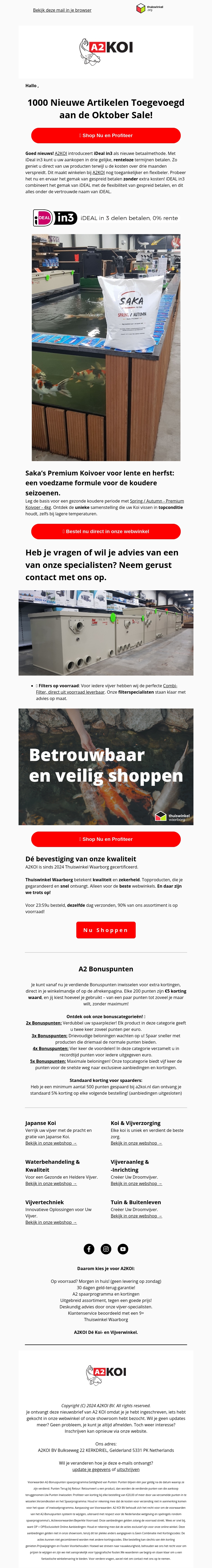 Profiteer van de Oktober Sale met meer dan 1000 nieuwe artikelen toegevoegd aan het assortiment. Krijg exclusieve kortingen op premium producten zoals Saka’s Premium Koivoer. Ontdek betrouwbare en veilige winkelmogelijkheden. Stel vragen aan onze specialisten voor het beste advies. Mis de kans niet om te besparen op waardevolle items.