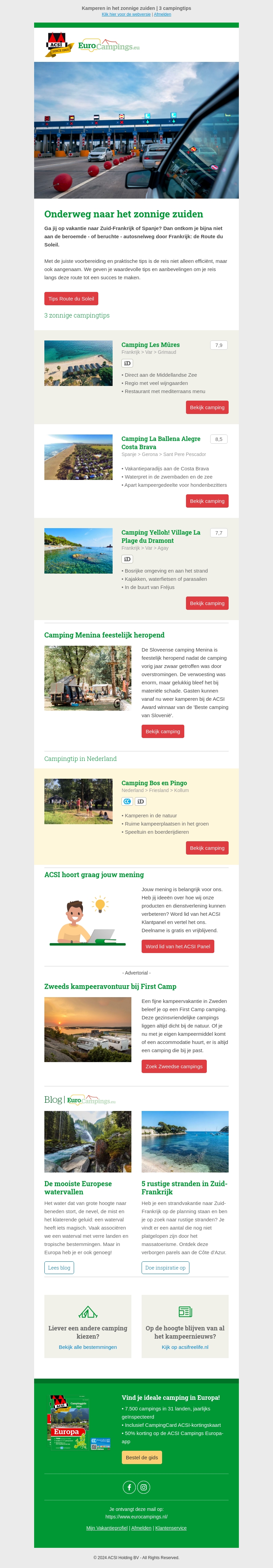 Ga je op vakantie naar Zuid-Frankrijk of Spanje? Ontdek onze voorbereidingstips voor de Route du Soleil. Bezoek drie fantastische campings en geniet van je reis! Vergeet niet je mening te geven over onze diensten en lees ons blog voor adembenemende watervallen en stranden.