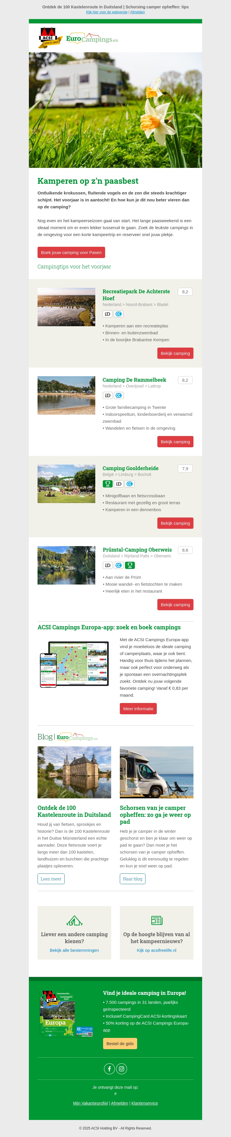 Klaar voor een paasavontuur? Verken de mooiste campings met handige tips en suggesties. Of je nu zoekt naar een camping met kinderactiviteiten, fietsroutes, of gewoon een rustig plekje in de natuur, je vindt het hier. Boeken doe je gemakkelijk online. Maak gebruik van onze handige app voor de beste ervaring. Begin jouw lente avontuur vandaag nog.