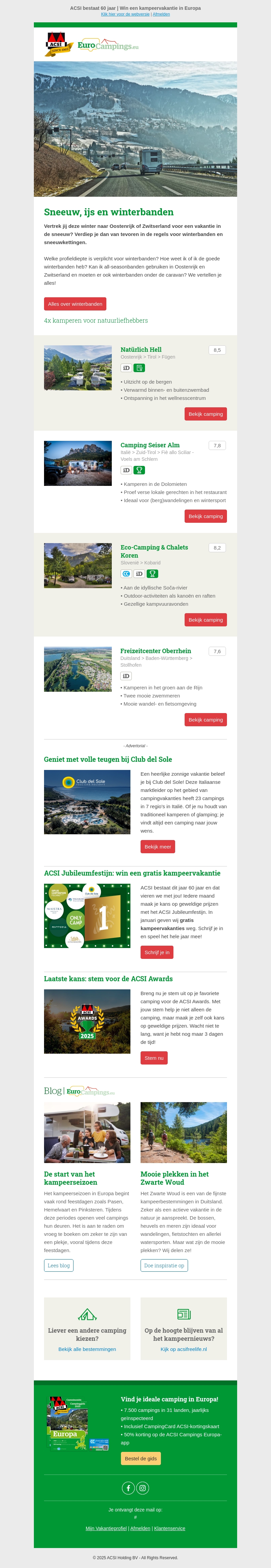 Ga je deze winter naar Oostenrijk of Zwitserland? Zorg ervoor dat je voorbereid bent met de juiste winterbanden. Ontdek de beste kampeerplekken en maak kans op een gratis kampeervakantie met ACSI. Stem ook voor jouw favoriete campsite in de ACSI Awards!