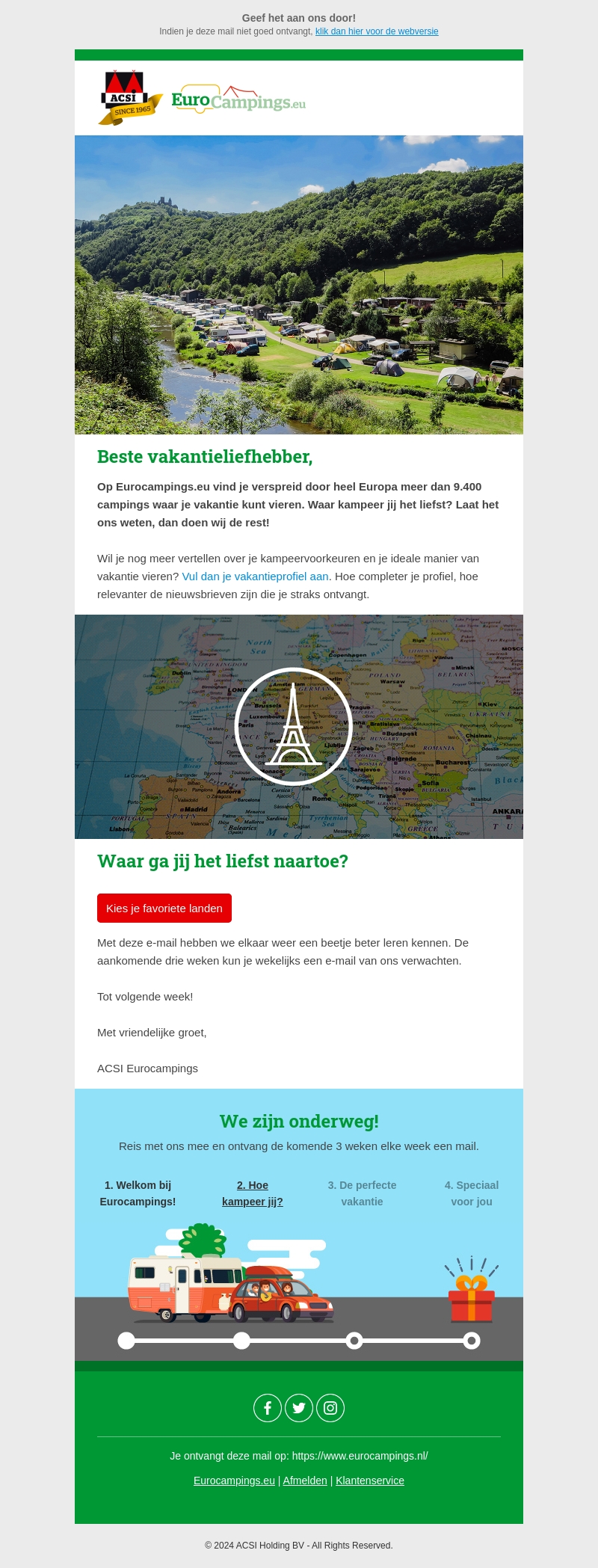 Beste vakantieliefhebber, ontdek meer dan 9.400 campings in Europa waar je kunt kamperen. Vul jouw kampeerprofiel in om gepersonaliseerde nieuwsbrieven te ontvangen. Kies je favoriete vakantiebestemming en geniet van de beste kampeerervaringen.