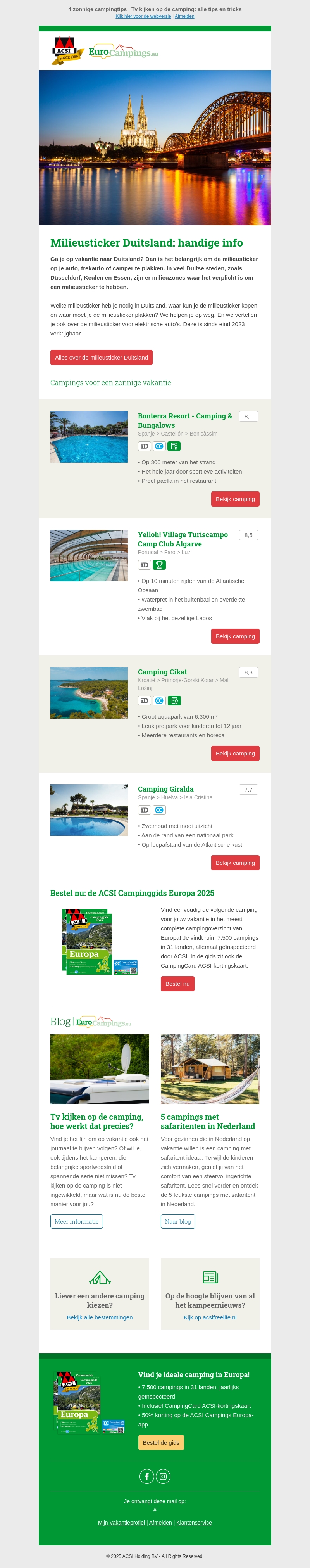 Ga je met de auto naar Duitsland? Dan is het belangrijk te weten welke milieusticker je nodig hebt. In deze nieuwsbrief vind je handige tips over het verkrijgen van de juiste sticker voor stedelijke gebieden zoals Düsseldorf en Keulen. Ontdek ook prachtige campings in Spanje en Kroatië voor een zomerse vakantie.