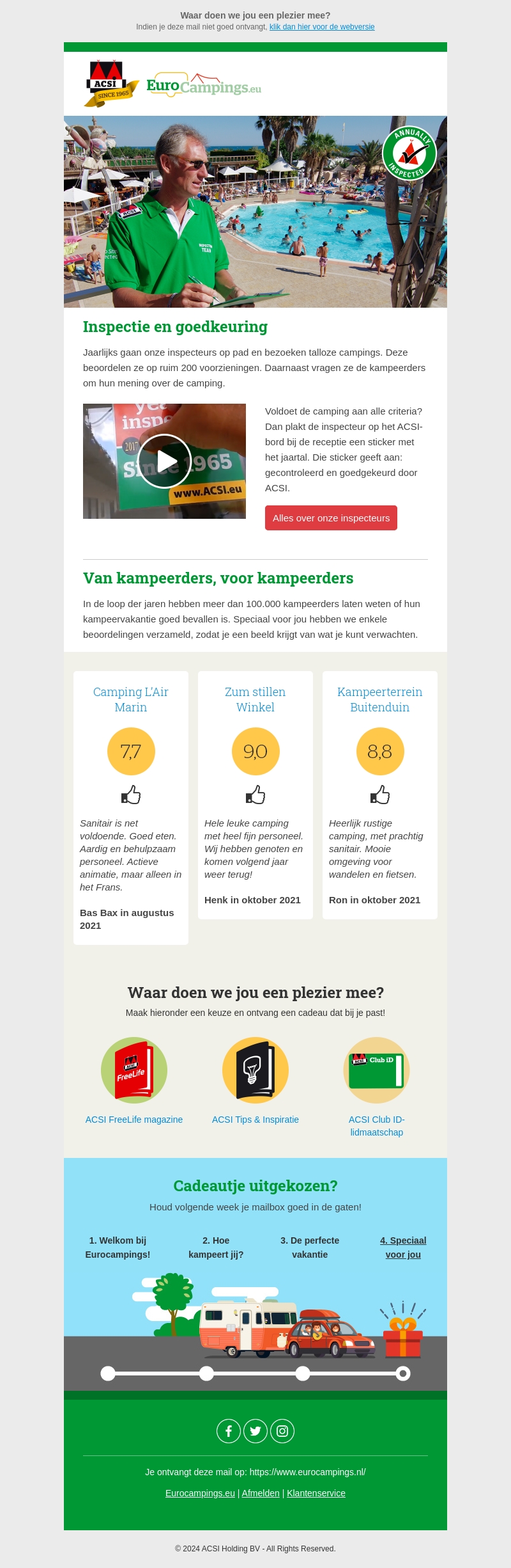 Elk jaar inspecteren ACSI inspecteurs talloze campings en beoordelen ze meer dan 200 voorzieningen. Deze nieuwsbrief biedt beoordelingen van populaire campings en laat kampeerders hun ervaringen delen, zodat je zeker bent van een camping die bij je past. Ontdek betrouwbare campings en haal inspiratie uit tips en verhalen van andere kampeerders.