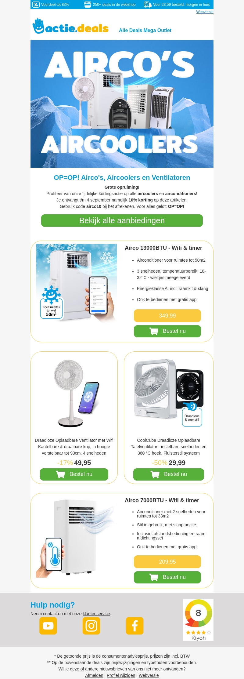Grote opruiming! Profiteer van onze tijdelijke kortingsactie op alle airco's, aircoolers en ventilatoren. Je ontvangt t/m 4 september namelijk 10% korting op deze artikelen. Gebruik code airco10 bij het afrekenen. OP=OP!