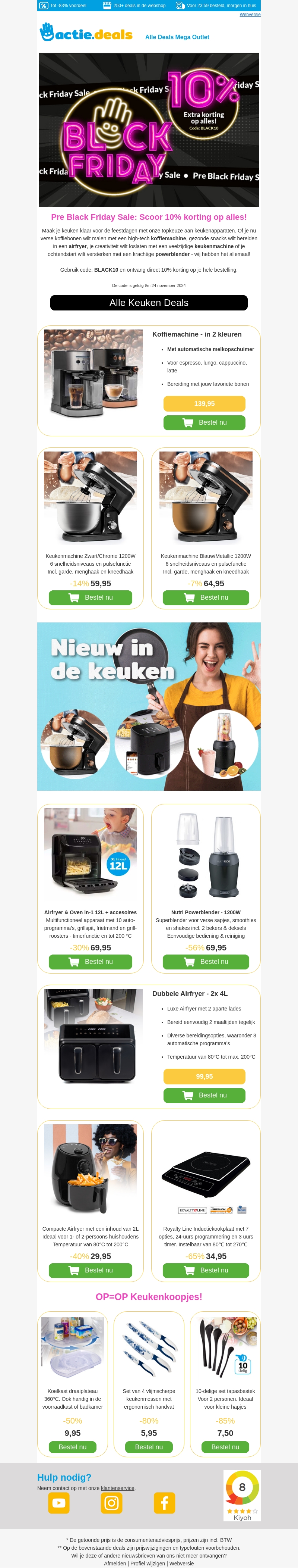Beleef de beste koopjes tijdens onze Pre Black Friday Sale met 10% korting op alles. Upgrade je keuken met topkwaliteit koffiemachines, multifunctionele keukenmachines, en krachtige powerblenders. Mis de kans niet om te besparen en geniet van de beste deals. Bekijk ons uitgebreide aanbod en bestel vandaag nog!