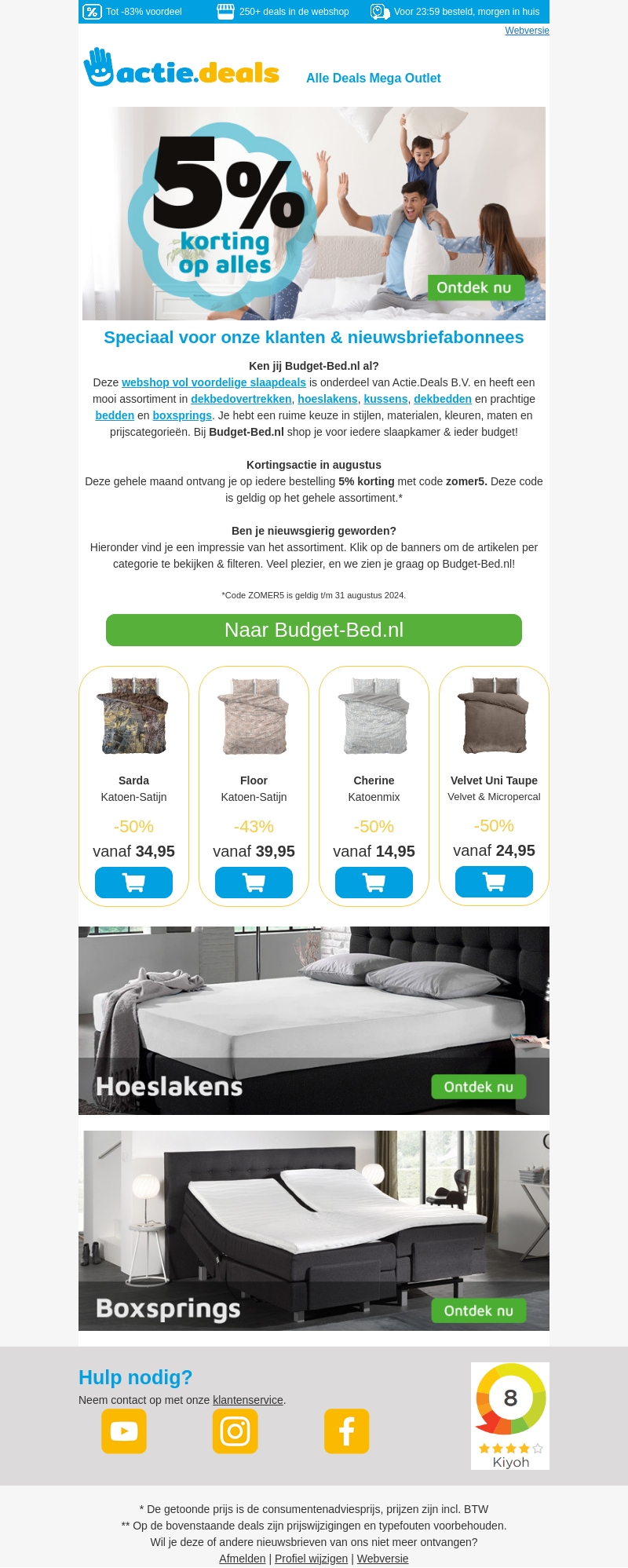Speciaal voor onze klanten en nieuwsbriefabonnees biedt Budget-Bed.nl deze maand 5% extra korting op alles met de code ZOMER5. Deze kortingscode is geldig op het gehele assortiment, inclusief dekbedovertrekken, hoeslakens, kussens, dekbedden en boxsprings. Mis het niet en shop nu voor jouw slaapkamerinrichting!