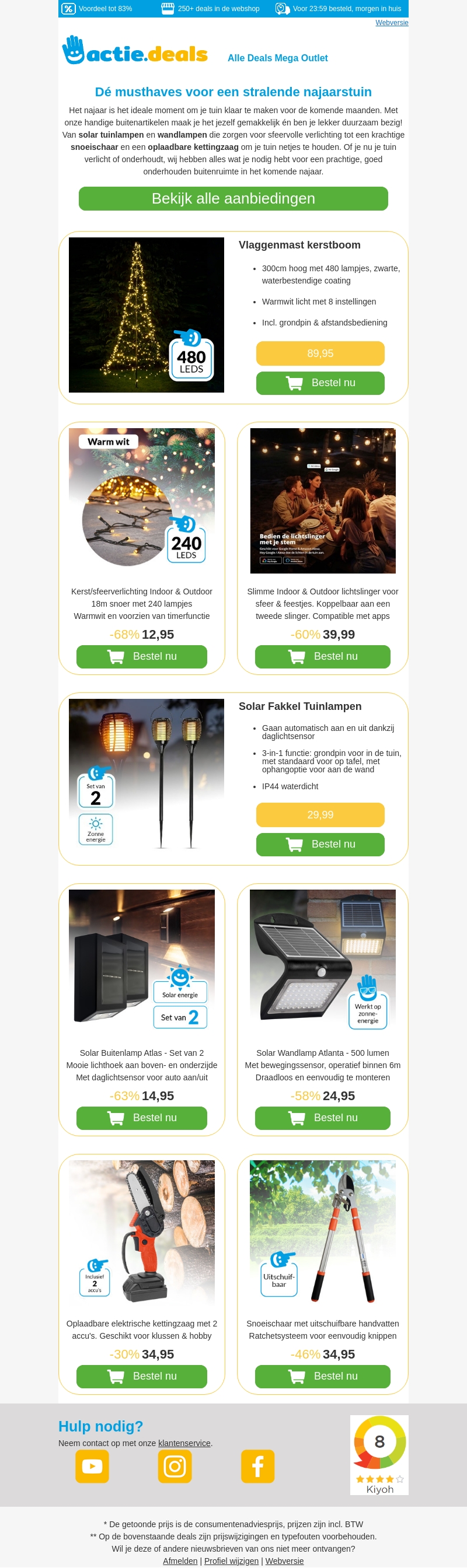 Het is tijd om je tuin klaar te maken voor het najaar! Deze nieuwsbrief biedt een selectie aan onmisbare tuinartikelen. Verlicht je tuin sfeervol met onze solar tuinlampen. Ontdek ook krachtige tuingereedschappen zoals een snoeischaar en een oplaadbare kettingzaag. Alles wat je nodig hebt om je tuin prachtig en goed onderhouden te houden.