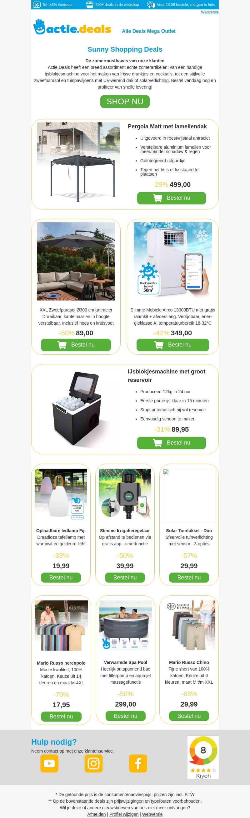 Bekijk onze Zomer Top 10 bij Actie.Deals! Vind geweldige zomerartikelen zoals een pergola, XXL zweefparasol, slimme airco, ijsblokjesmachine en meer. Profiteer van hoge kortingen en snelle levering!
