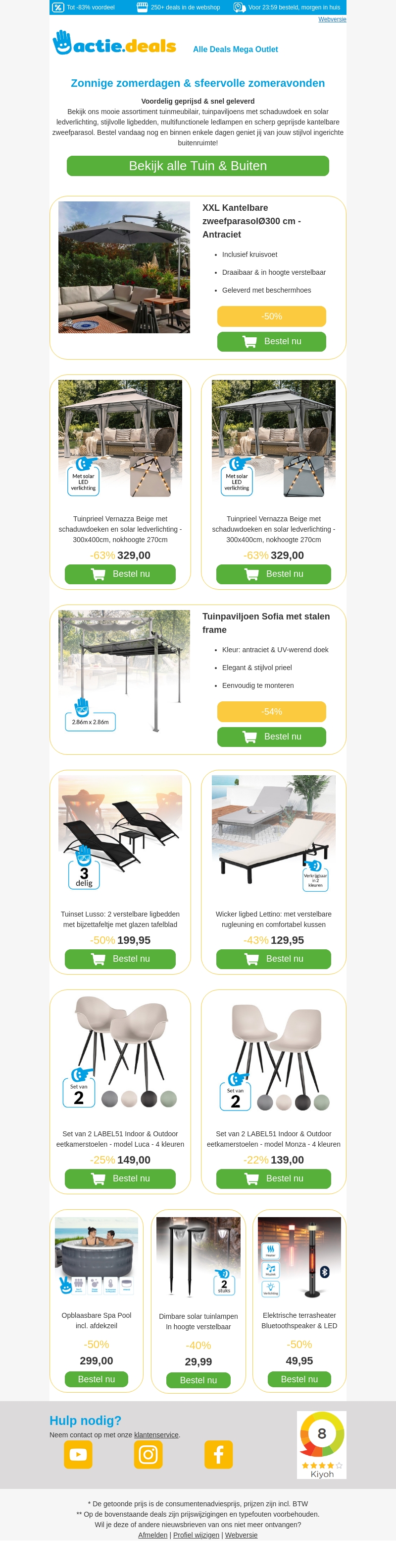Bekijk ons betaalbare assortiment buitenmeubilair bij Actie Deals. Van kantelbare zweefparasols tot tuinpaviljoens en comfortabele ligbedden. Perfect voor jouw tuin of balkon. Bestel nu en geniet van mooie kortingen!