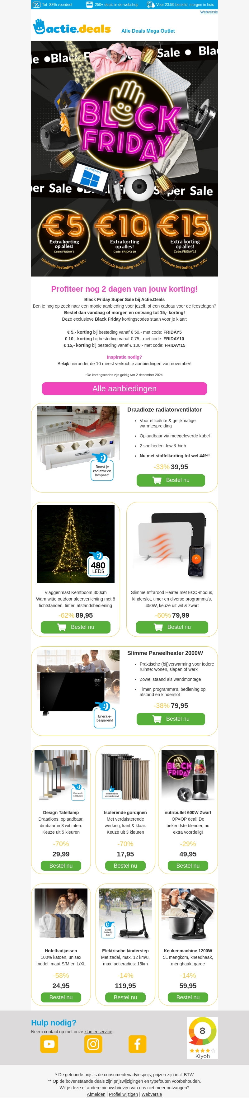 Mis deze kans niet op exclusieve Black Friday deals bij Actie.Deals. Profiteer van kortingen tot β¬15 op je aankoop. Bestel vandaag of morgen om van deze speciale aanbiedingen te kunnen genieten. Vergeet niet de juiste kortingscode te gebruiken bij je bestelling. Deze top 10 selectie is geldig tot 2 december 2024.