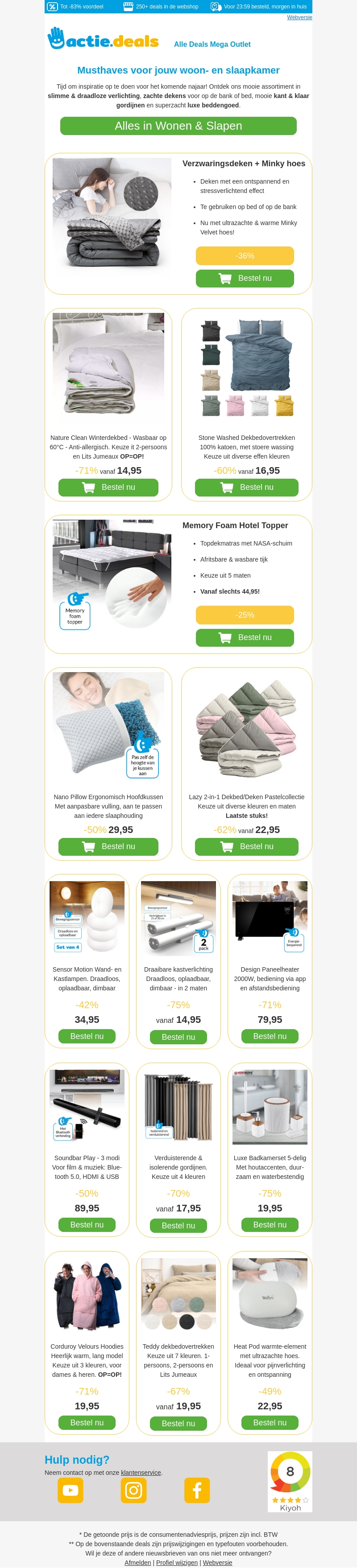 De herfst is begonnen en wij hebben alles wat je nodig hebt om je huis gezellig en warm te maken. Ontdek onze nieuwste collectie van dekens, dekbedovertrekken, heaters, gordijnen, en meer. Profiteer van geweldige kortingen en maak je klaar voor de herfst.