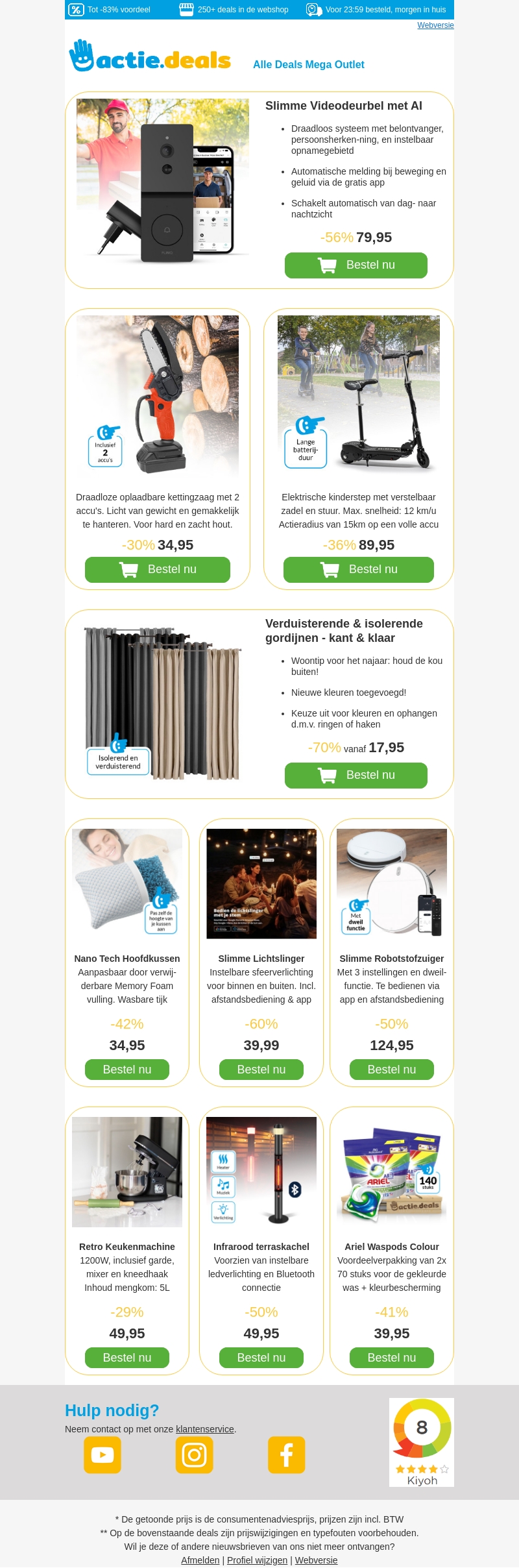 Deze week introduceert Actie.deals de top 10 beste aanbiedingen. Geniet van scherpe kortingen op producten zoals slimme video deurbel, draadloze kettingzaag, elektrische kinderstep, verduisterende gordijnen en meer. Bestel nu en profiteer van deze top deals!