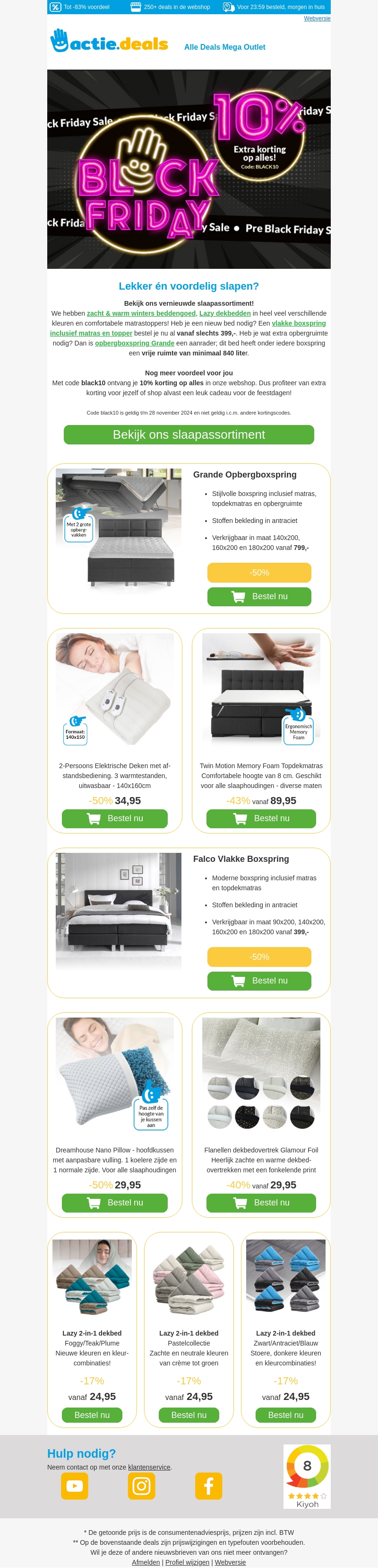 Verwen jezelf met ons vernieuwde slaapassortiment tijdens Black Friday! Ontdek onze stijlvolle boxsprings, comfortabele dekbedden, en hoogwaardige kussens. Profiteer van 10% extra korting met de code BLACK10. Kijk voor aanbiedingen zoals de Falco Vlakke Boxspring en de Dreamhouse Nano Pillow. Haal het beste slaapcomfort in huis met kortingen tot wel 63%!