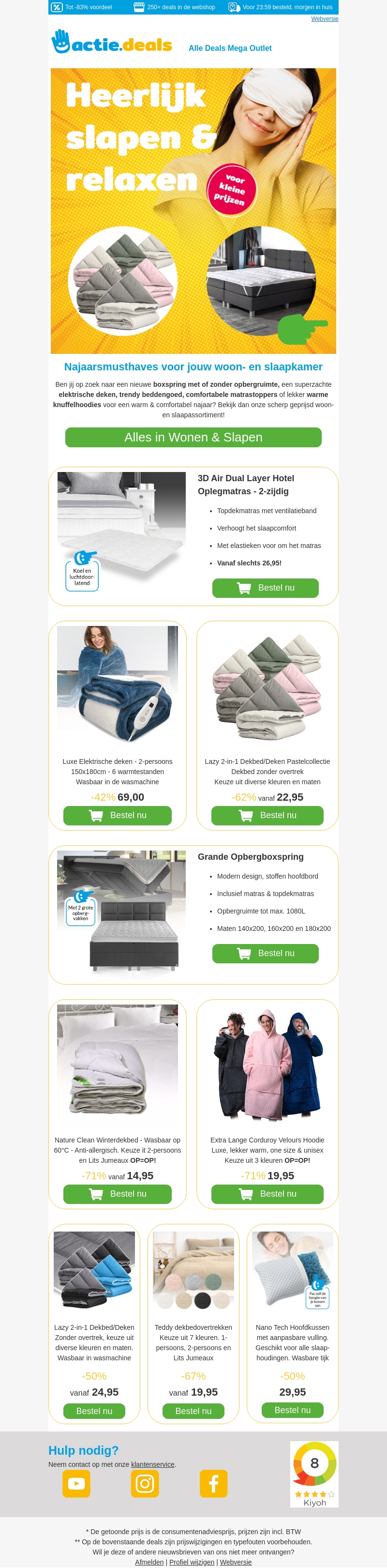 Breng je woon- en slaapkamer naar een hoger niveau met onze geweldige aanbiedingen. Geniet van warme elektrische dekens, comfortabele boxsprings en stijlvolle beddengoed sets. Perfect voor de herfst! Bekijk nu onze scherpe prijzen en verrijk je slaapprofiel. Actie geldig zolang de voorraad strekt.